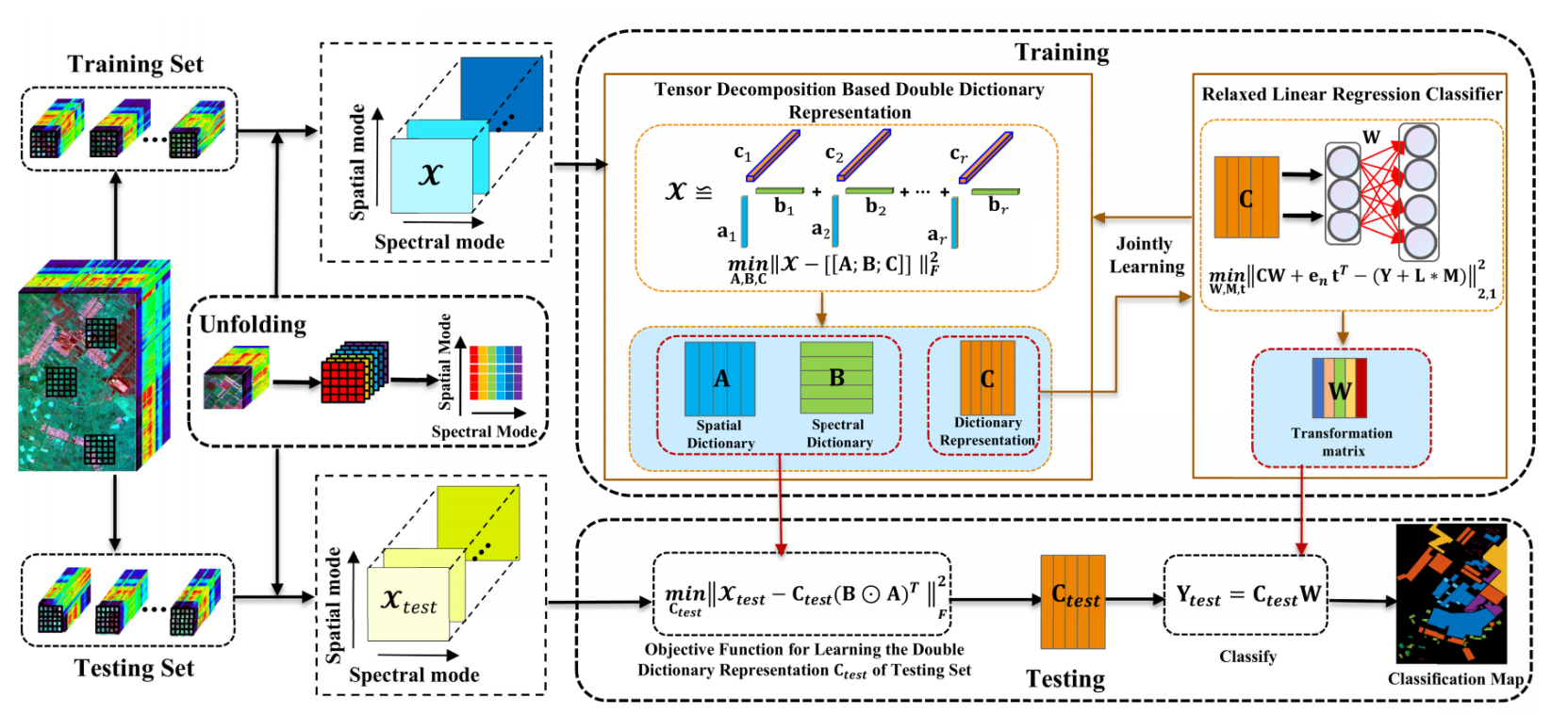 高光谱图像(Hyperspectral Image, HSI)因其在智慧农业、环境监测等众多领域具有良好应用前景而备受关注。然而,受限于数据维度高、结构复杂、以及噪声高等问题,HSI分类仍面临诸多挑战。鉴于此,邓阳君等结合张量CP 分解理论与线性回归分类器,首次建立了张量字典表示学习与回归分类一体化模型,同步实现了高光谱图像的空谱结构信息协同编码与分类器学习,从而在一定程度上解决了高阶结构信息提取困难和分类器鲁棒性不足的问题,为高阶张量数据分类提供了新思路。未来,该方法有望应用于作物估产、病虫害识别等多种农业遥感场景中,为推动高光谱技术在农业领域的应用发展提供理论基础与技术支撑。