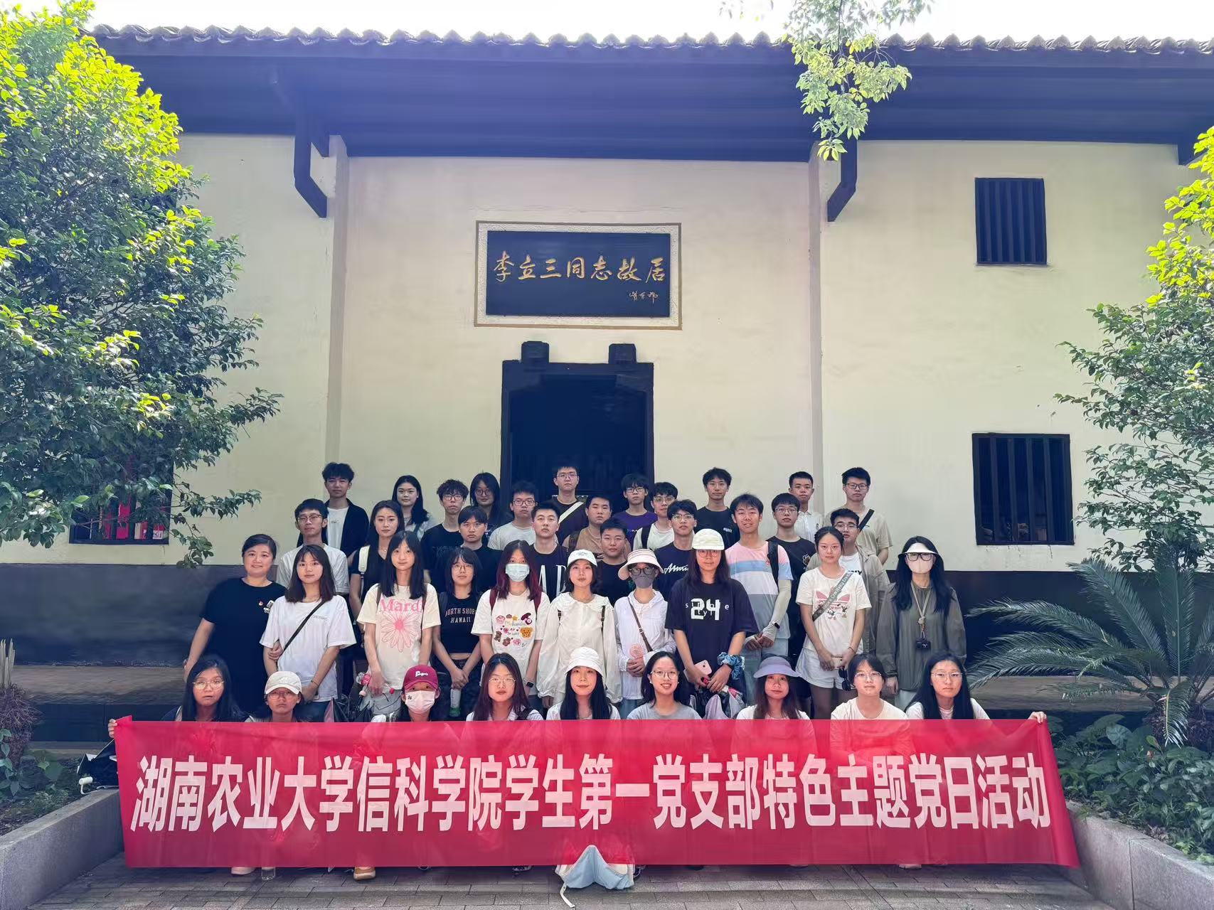 上午,寻迹红色地标,感悟历史底蕴。抵达李立三故居后,全体支部党员参观了陈列馆,通过详实的史料和展品了解李立三同志领导工人运动等革命事迹,深刻感悟其坚定的理想信念与无私的奉献精神。随后走进故居参观,这座土木结构的庭院式民居古朴宁静,"芋园"门额与"春华秋实,日升月恒"的门联相映成趣,展现了传统建筑的人文底蕴。参观结束后,彭微薇书记和翁婕书记为新一批预备党员分发党徽,并带领全体党员重温入党誓词,最后在故居门前合影留念。