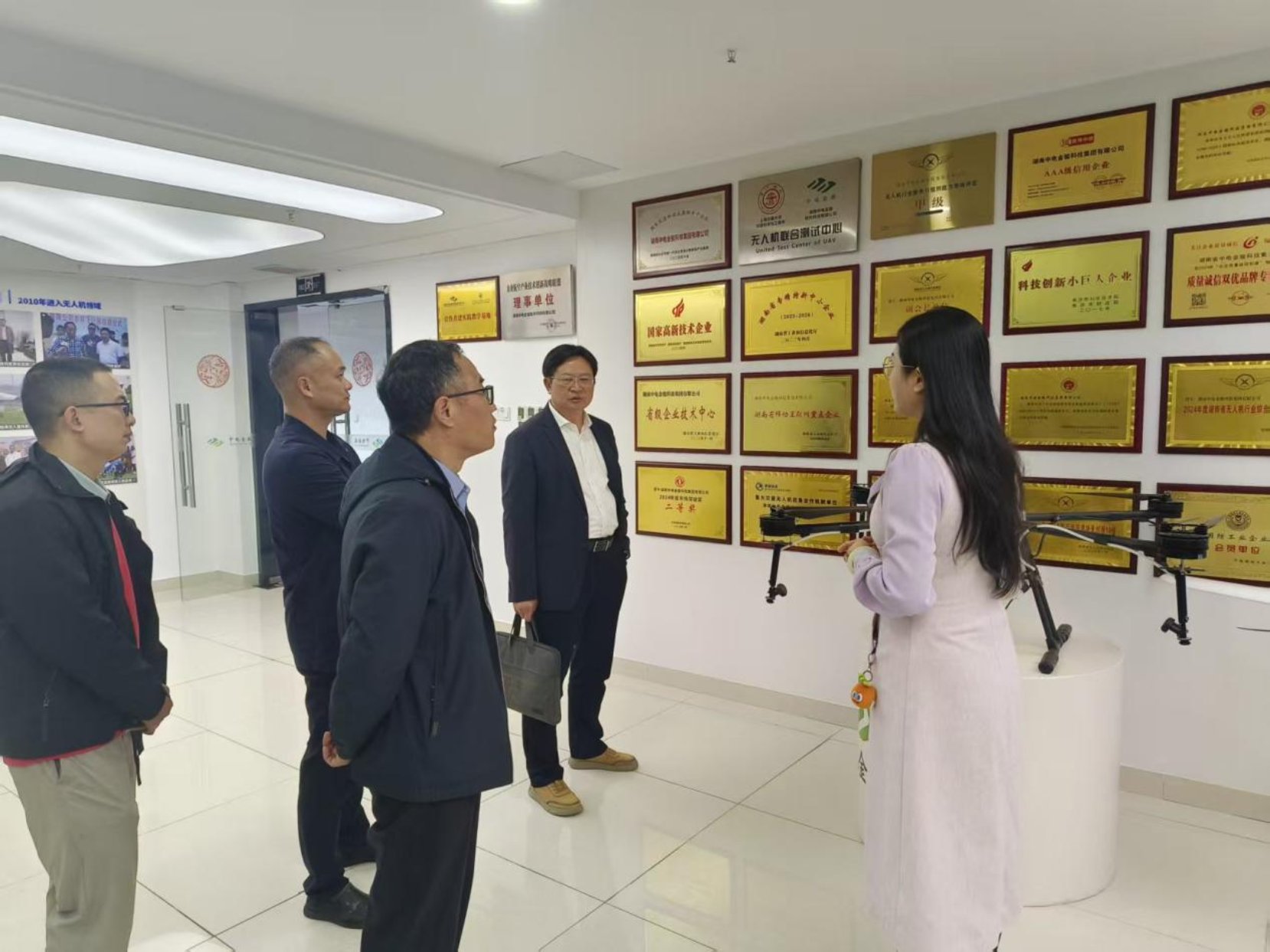 参观中,中电金骏科技有限公司负责人详细介绍了企业的发展历程、业务布局及核心技术实力。公司业务涵盖农业植保、应急救援、电力、水利、测绘、公安、培训等多个领域,主要产品包括农用无人机、无人机智能巡检车(电力、水利、应急版)、无人机充电机器人及各类无人机研发服务。公司拥有20余项发明专利和40余项软件著作权,具备研发、生产、销售、应用服务及软件平台建设等“一站式”综合服务能力,并参与多项国家标准的制定。同时,公司已建立成熟的无人机培训体系,针对农业用户和民航持证用户分别提供系统化培训课程。